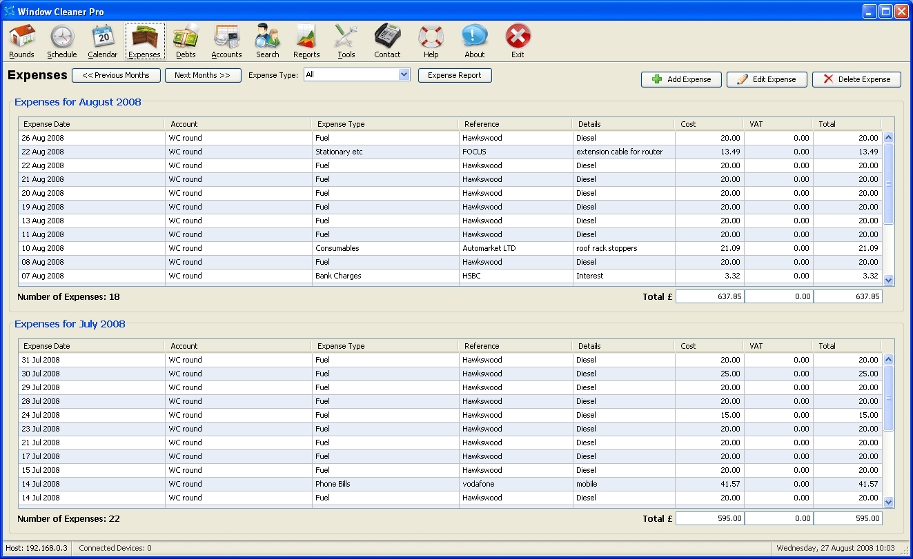 Expenses Screen - Showing you all expenses for the last 2 months.